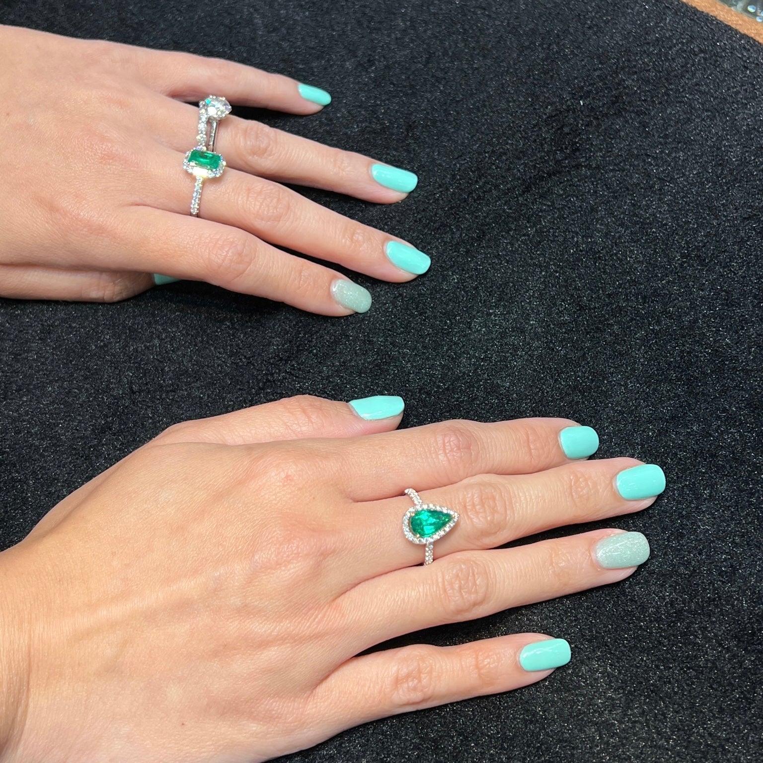 Thanks Desiree Gems for letting me try all these beautiful rings on my fingers. Finally decided to get only the Pear shaped Colombian Emerald Ring, the color is so neon and the crystal is just so sparkling. I have been wearing this ring to the office, dinner, gathering, basically everywhere.